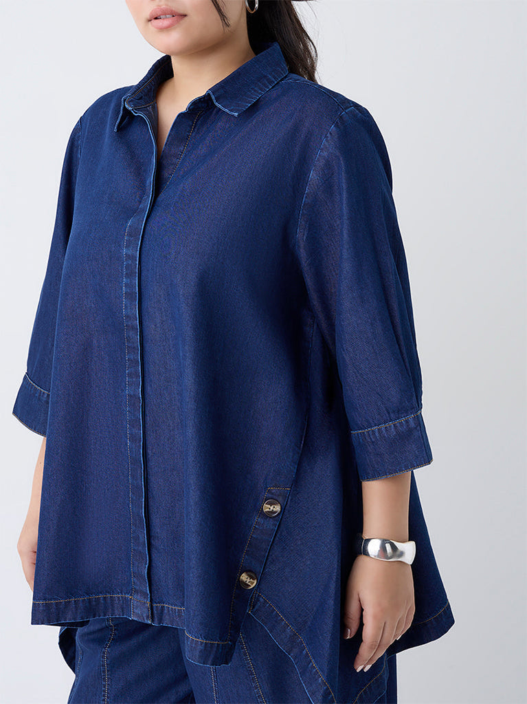 Designed for days when you want denim with a softer edge, this dark blue denim blouse by Gia features a flattering shape that moves with you. Made from a cotton-blend fabric, it comes with a collar, concealed placket and 3/4th sleeves, while the asymmetric hemline elongates the frame for an elevated finish.