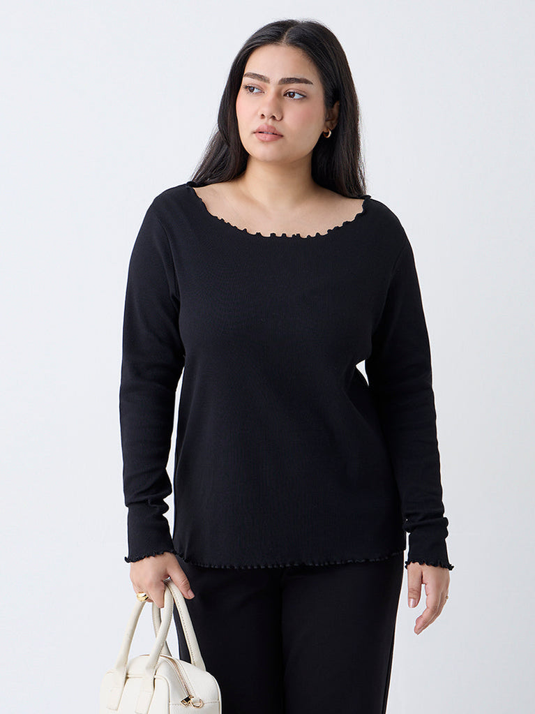 Add a touch of elegant comfort to your day with this black ribbed t-shirt from Gia. The textured fabric offers gentle stretch for a curve-loving fit, while the fluted boat neckline brings a soft, feminine finish. Full sleeves add cozy coverage, making it a chic choice for polished everyday dressing.