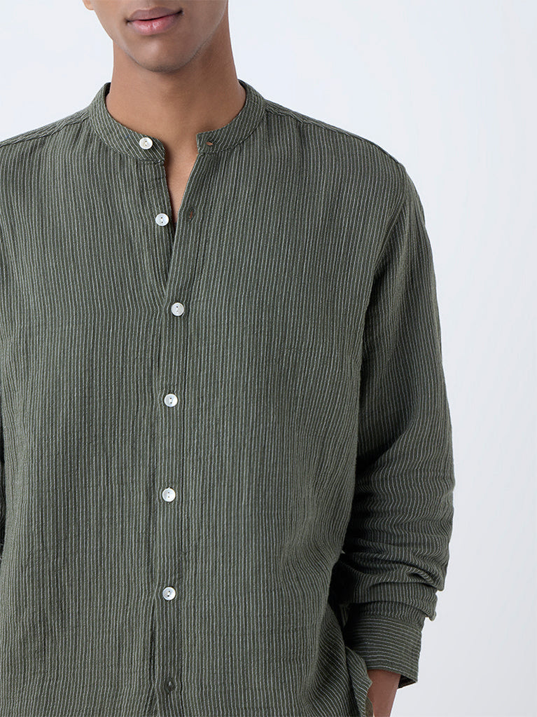 Keep it simple and stylish with this olive striped shirt from ETA. Made from breathable cotton in a relaxed frame, it features a band collar, button-down front, and full sleeves.