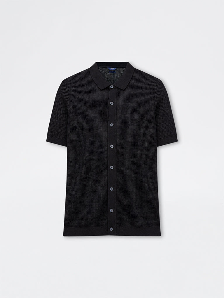 Refresh your off-duty edit with this black shirt from Ascot, designed to offer easy refinement with a modern edge. Spun from a rich fabric blend with a knit-textured finish, it is cut in a relaxed fit and features a collar, button-up front, and short sleeves. A polished option for effortless casual wear.