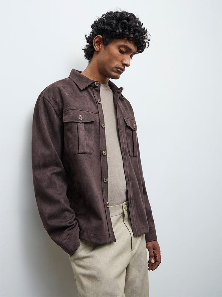 Layering takes on a refined edge with this dark brown jacket from Ascot. Structure in a relaxed fit, it features a crisp collar, a button-up front, full sleeves, and envelope pockets for a clean, structured look. Milled from a premium-blend fabric with a suede finish, it offers a smooth hand feel suited for cooler days and elevated casual styling.