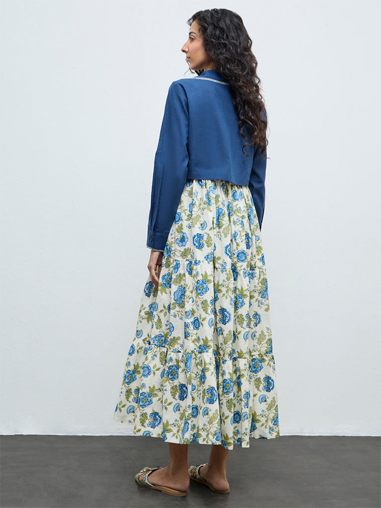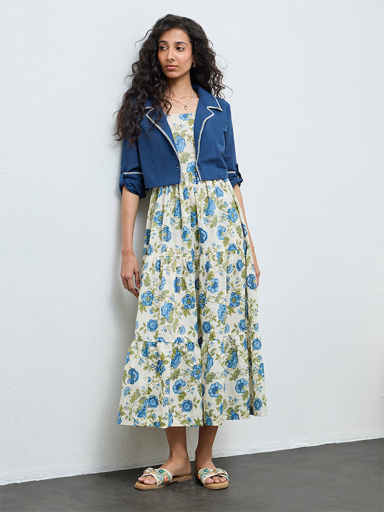 Amplify your boho wardrobe with this blue floral dress set from Bombay Paisley. Shaped in a tiered silhouette, the pure cotton dress features a square neckline and adjustable shoulder straps for an easy fit. Paired with a cropped jacket finished with a notched lapel collar and full sleeves, the ensemble blends relaxed charm with elevated styling for weekend outings and getaways.