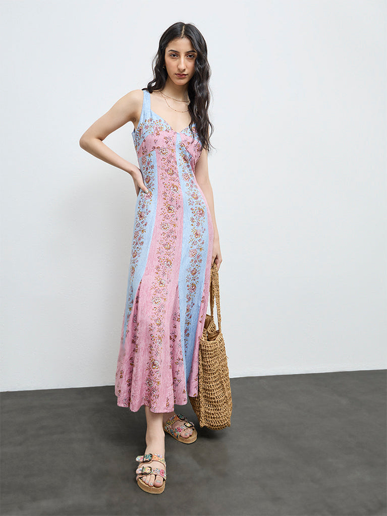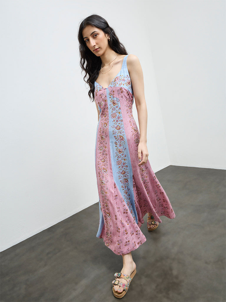 Channel effortless femininity in this multicolour dress from Bombay Paisley, patterned with delicate botanical motifs. Cut in a relaxed A-line shape, it features a plunging V-neck and sleeveless profile that feels airy and unfussy. Made from pure cotton, it is an easy pick for warm-weather dressing with a boho sensibility.