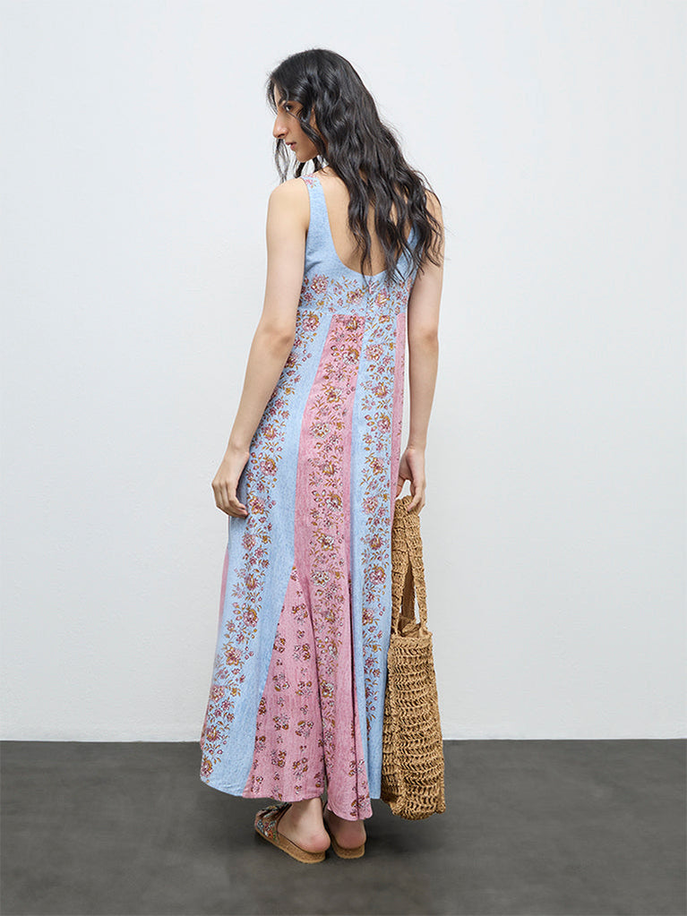 Bombay Paisley presents this blue floral dress designed with a square neckline and a sleeveless, strap-shouldered silhouette. A smocked back creates a cinched fit, while the A-line shape enhances volume and graceful movement. Crafted in a subtly textured fabric, it delivers a twirl-ready finish with an easy, feminine charm.