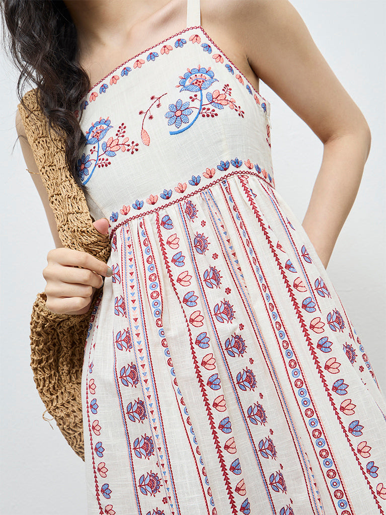 Embrace effortless femininity with this off-white dress from Bombay Paisley, highlighted by delicate floral embroidery. Woven from pure cotton, it flows through an A-line silhouette, while the square neckline and adjustable shoulder straps offer both structure and comfort for warm-weather dressing.