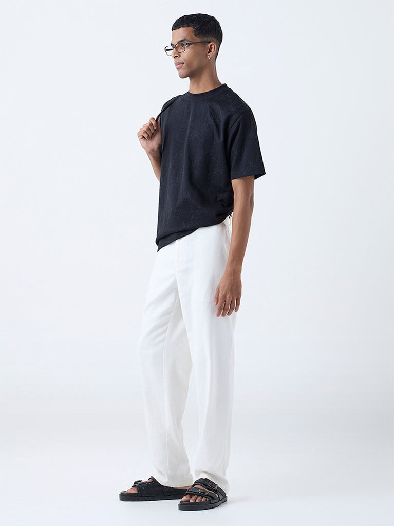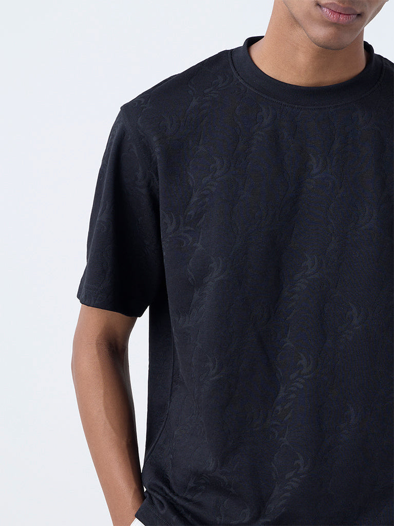 ETA brings this black t-shirt crafted from breathable fabric, enhanced with botanical textures across the surface. Styled in a relaxed frame, it carries a round neck and short sleeves for everyday ease. Balanced in design, it delivers comfort while keeping the look understated yet contemporary.