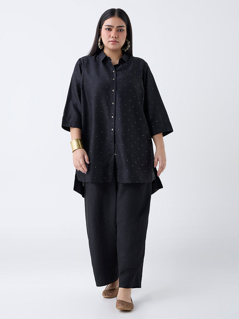 Amplify your festive wardrobe with this black ethnic tunic from Diza, adorned with delicate embellishments that add a subtle shimmer. Designed with a collar and button placket, it is finished with three-fourth sleeves for an elegant yet versatile look.