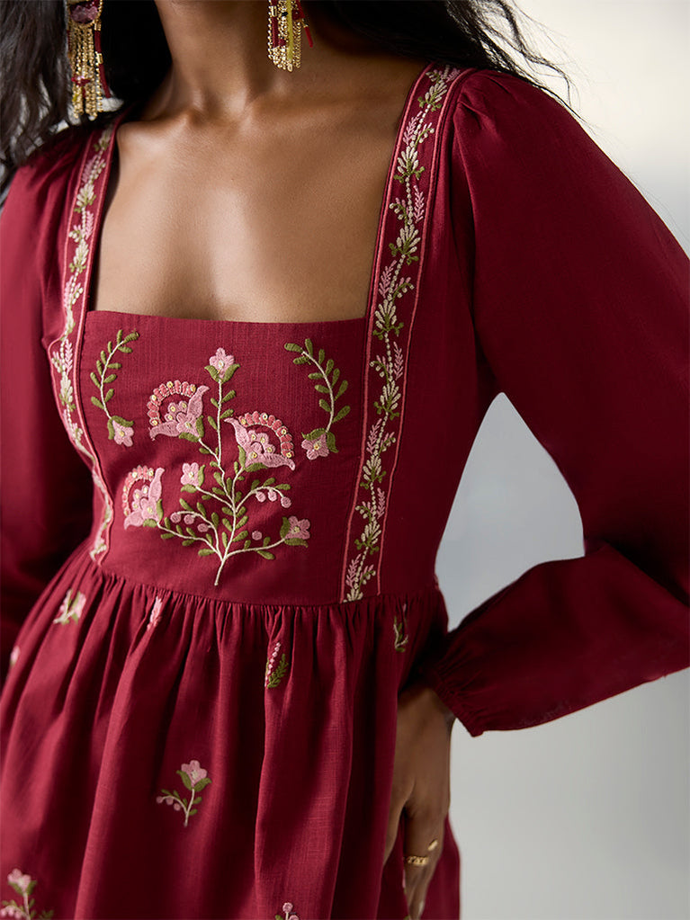 Bombay Paisley launches this red dress styled with a square-neck, peasant sleeves and a back zipper for an easy wear. Showcasing striking floral embroidery, this pure cotton garment offers breathable comfort, making it a graceful choice for day-to-evening occasions.