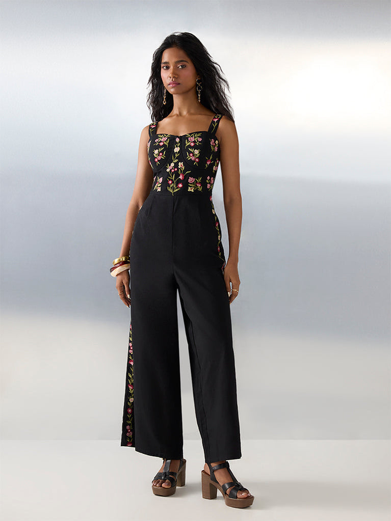 Bombay Paisley brings this black jumpsuit featuring vibrant floral embroidery for an elevated ethnic touch. It is framed with a square-neck, adjustable straps and a smocked back for comfortable fit. Made from a cotton-blend fabric, it is completed with side pockets for a functional finish.