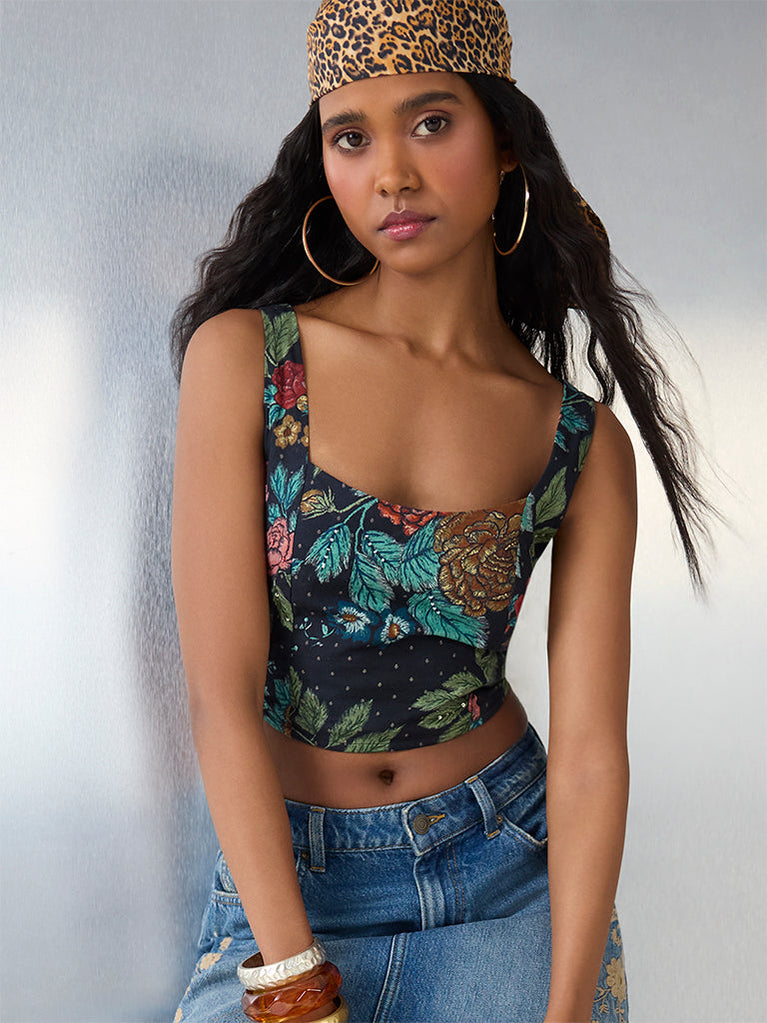 This black dress by Bombay Paisley boasts vivid floral patterns throughout an A-line silhouette. Crafted from cotton-rich fabric, it is framed with a scoop-neck and adjustable straps, offering superior comfort. An easy summer essential that pairs style with everyday ease.