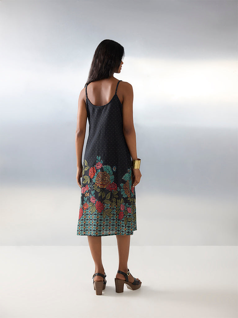 Bombay Paisley introduces this black shift dress, detailed with bold prints and floral patterns along the hem. Cut with a round neck and a sleeveless profile, it is crafted from cotton-rich fabric that feels soft and breathable. A chic design that blends everyday ease with a touch of statement style.