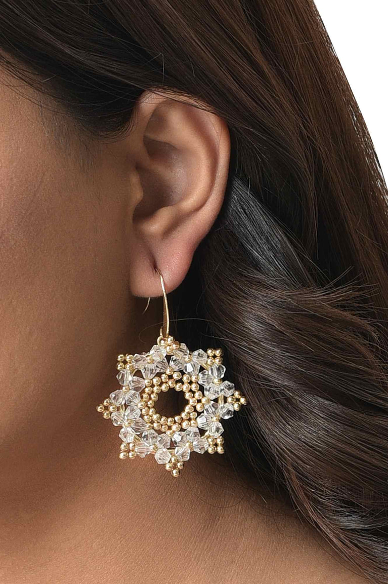 Classic round beige hoop earrings with facated dual tone crystal beads.