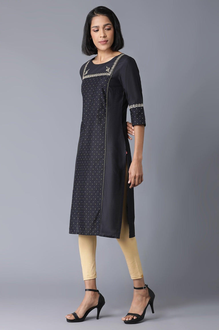 Black Coloured Panelled Straight kurta Featuring Floral Print, A Round Neck With Buttons And Three-Quarter Sleeves.