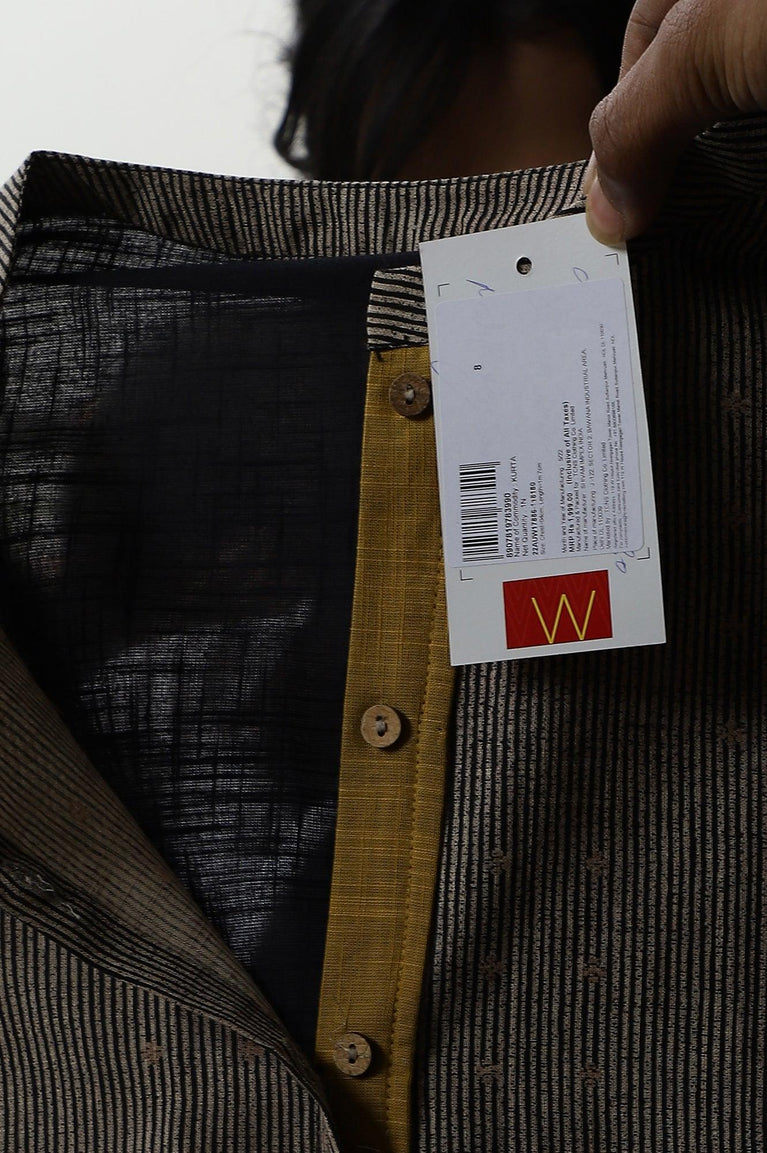 Beige Pinstripe Print Black Sleeve Blocked kurta With Mustard Stitch Line Detail