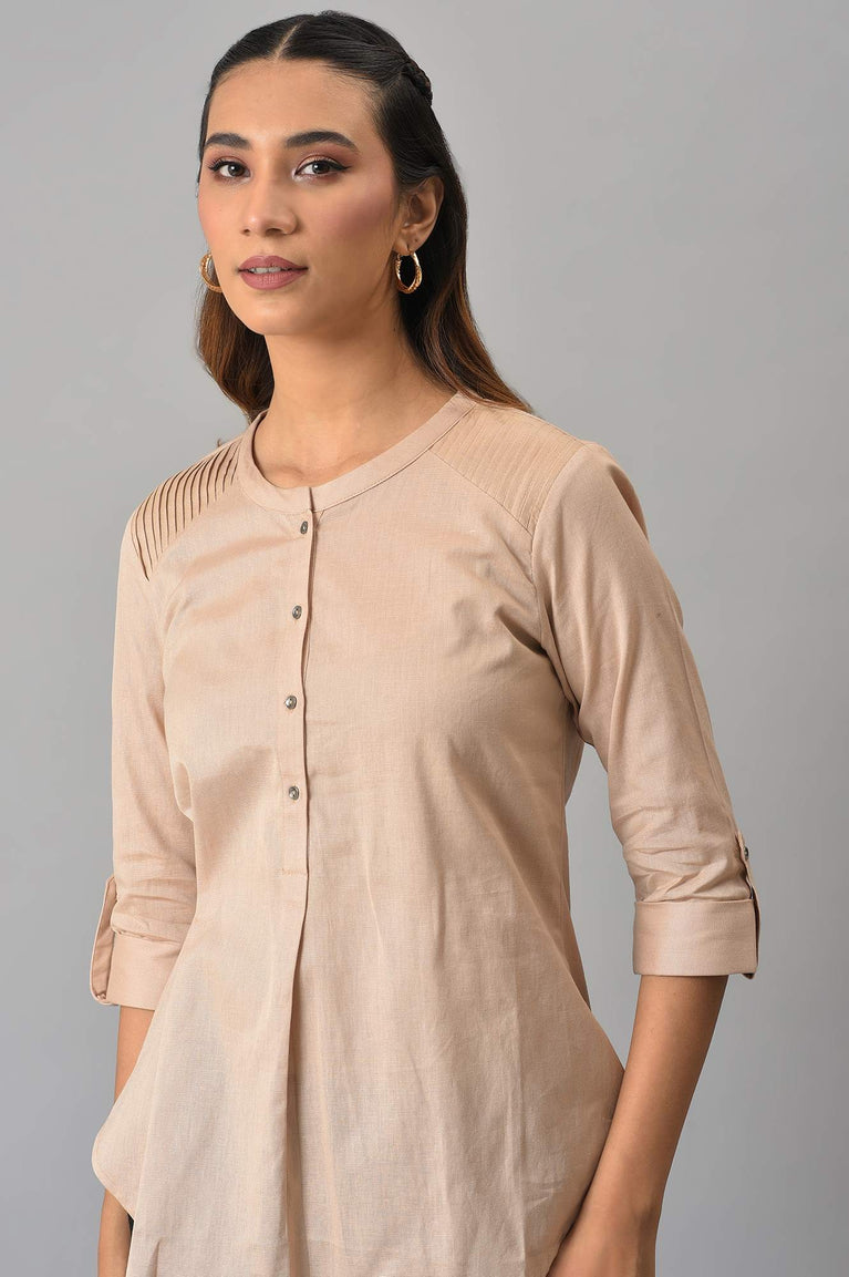 Beige Top With Mandarin Collar, Turn Up Sleeves With Tab And Pleat Detail On Shoulders. This Western Top By W Is A Perfect Pick For Your Coffee Date.