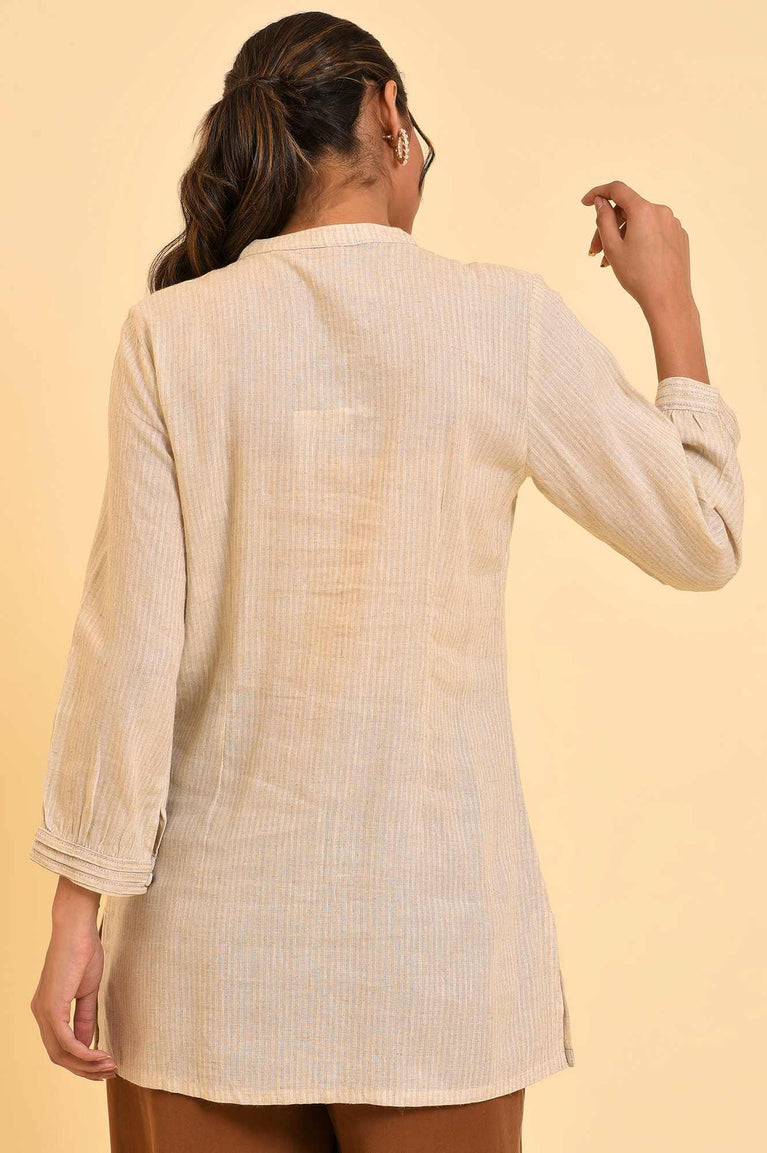 Elevate your casual wardrobe with this fusion-inspired women's top that seamlessly blends comfort and style. The beige-hued piece features eye-catching stripes, adding a touch of visual interest to your ensemble. Crafted with a band neckline, this straight-cut top offers a flattering silhouette suitable for various body types. The three-quarter sleeve length provides versatility, making it perfect for transitional seasons or layering. Constructed using a woven technique, the top boasts a unique composition of 50% rayon and 50% flax, ensuring breathability and a soft feel against the skin. This thoughtful blend of materials results in a garment that drapes beautifully and maintains its shape throughout the day. The fusion ethnicity of the design allows for easy pairing with both traditional and contemporary bottoms, making it a versatile addition to your wardrobe. Whether you're running errands, meeting friends for coffee, or enjoying a relaxed day out, this striped top is the ideal choice for casual occasions. Its timeless appeal and comfortable fit make it a staple piece that you'll reach for time and time again.