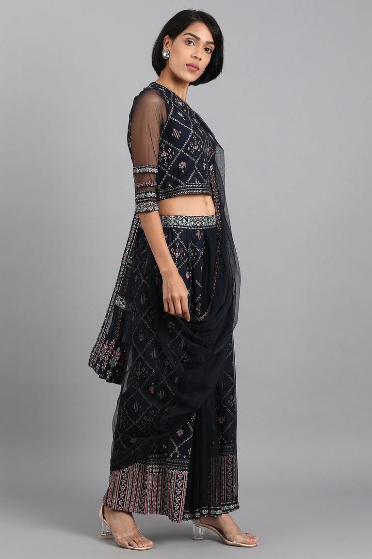 This blue round neck full sleeve kurta has embellished jacket and striped detail all-over.