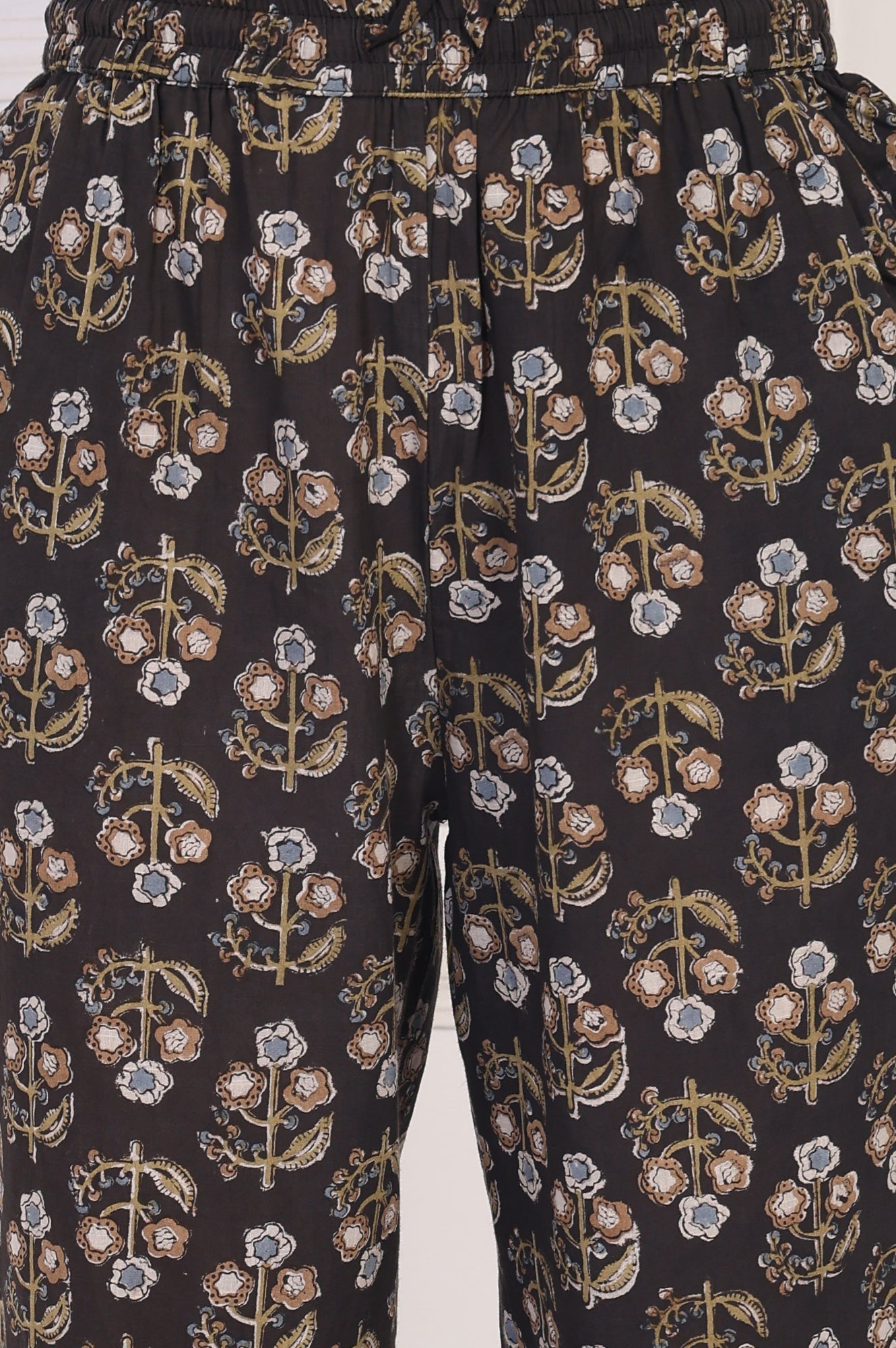 Black Floral Printed Embellished A-Line Cotton Kurta with Straight Pant and Dupatta Set