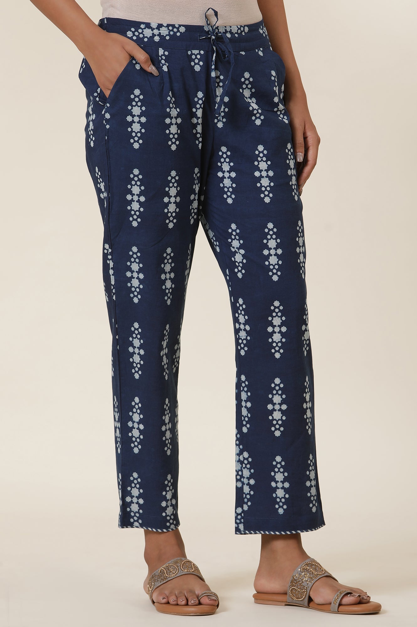 Modern & Elegant Dabu Block Print Straight Pants In Cotton Voile. Hemline Has Been Finished With Stripes Piping.