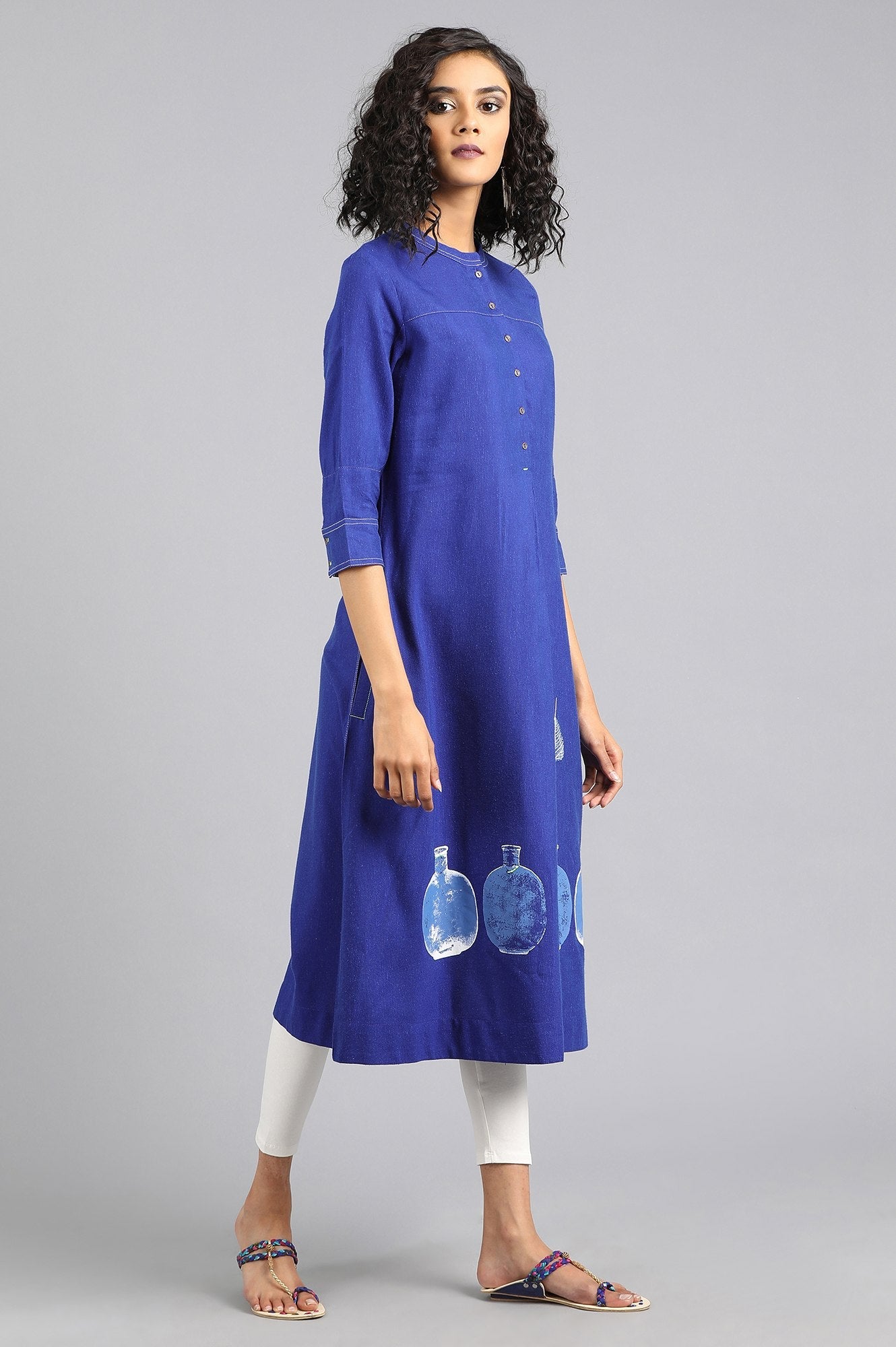 Blue mandarin neck 3/4 sleeve kurta with printed detail along with placket on the front.