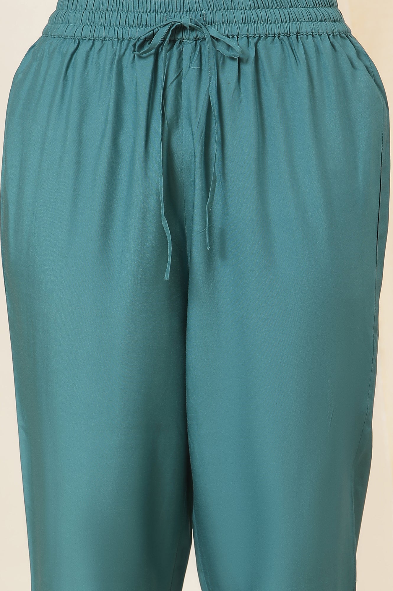 Crystal Teal Coloured Cotton Silk Panelled Kurta In Round Neck. This Rogan Block Printed Kurta Has Zari Embroidery On Neckline And Dori Tie-Up. It Further Features Kantha Work At Cuffs Of The Sleeves. It Is Paired With Matching Solid Straight Pants Which Is Accentuated With Mirror Work.