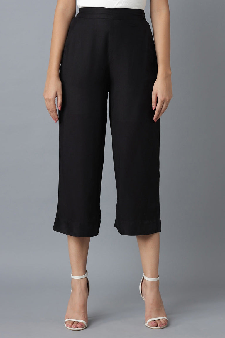 Get a classy look in this calf length black culottes. It has midrise and partially elasticated waist that gives a perfect fit. The solid culottes also has 2-side pockets.
