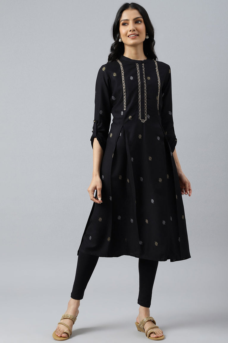 Black Mettalic Embroidered kurta With Pleats