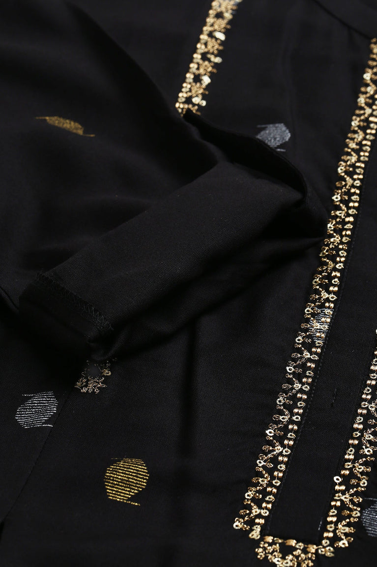 Make a statement at your next special event with this striking black kurta. Crafted from 100% viscose using a woven construction technique, this ethnic piece combines comfort and style effortlessly. The a-line silhouette flatters various body types, while the round neckline adds a touch of elegance. The three-quarter sleeves provide versatility for different seasons and occasions. What sets this kurta apart is its beautiful embroidery work, adding intricate details that catch the eye. The rayon fabric ensures a soft and breathable feel against your skin, making it comfortable for extended wear. This black kurta is a versatile addition to your wardrobe, perfect for those who appreciate the fusion of traditional design with contemporary aesthetics.