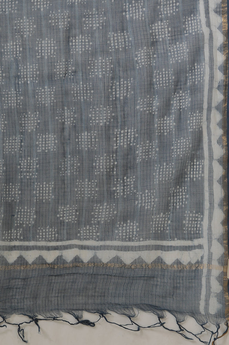 Indigo Dabu All Ober Buti Print Kota Doria Drape With Zari Border.