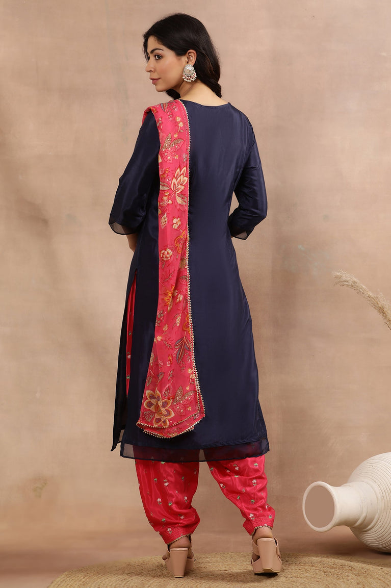 Deck Up With This Pretty Festive Kurta And Salwar Set. The Set Has Layered Embroidered Blue Kurta And Paired With Pink Printed Salwar Pants And Dupatta.