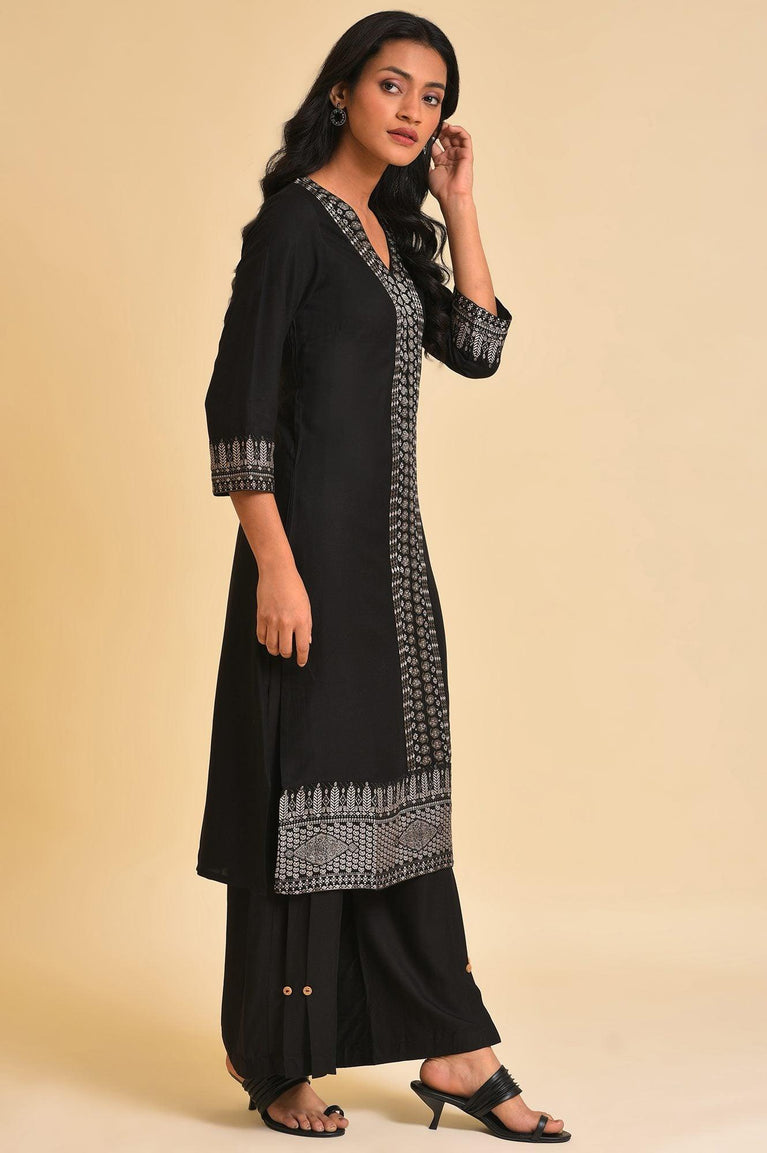Black Metallic Embroidery Cotton Blend Straight Kurta and Slim Pant Set