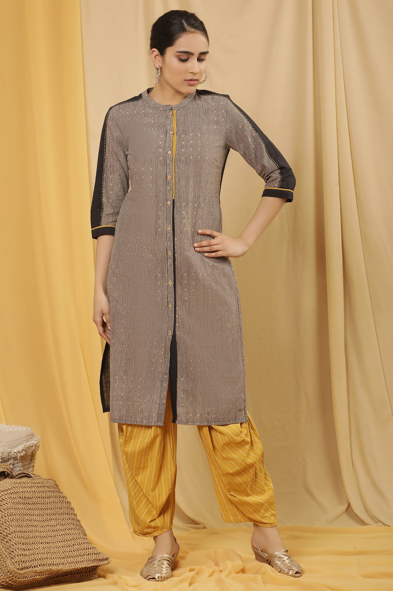 For Your Fusion Wear Craving Pick This Stylish W Kurta Set. The Set Has Black And Beige Stripe Kurta In Mandarin Collar With Button Placket. It Is Paired With Yellow Tucked Carrot Pants.