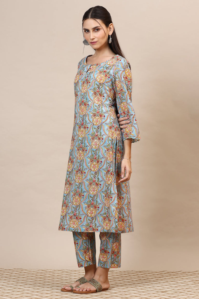 Blue Handblock Printed Kurta, Straight Pants and Dupatta Set