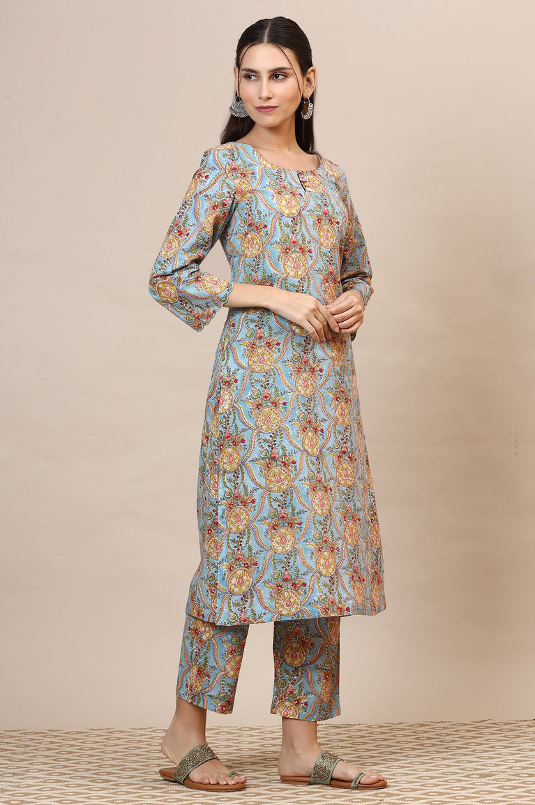 Get Ready For The Day Event In This Summer Season With This Pretty And Smoothing Blue kurta Set. The Set Has Glitter Printed A-Line kurta In Round Neck. It Is Paired With Printed Pants And Ecru Glitter Printed Dupatta.