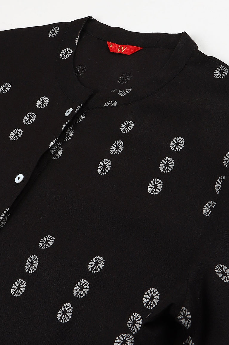 Get Ready For The Elegant And Stylish Office Look With This Printed Black Shirt Kurta. The Kurta Has Mandarin Collar And Button Placket. It Is Paired With Black Slim Pants Having Contrast Embroidery On Hemline.