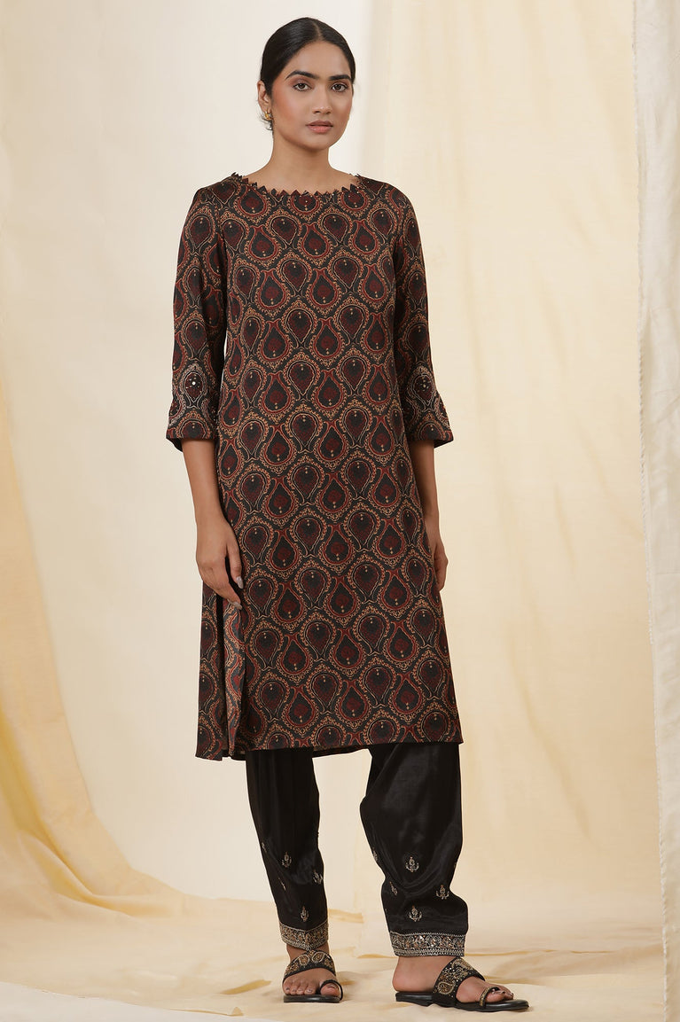 Black Ajrakh Print Kurta In Lustrous Satin