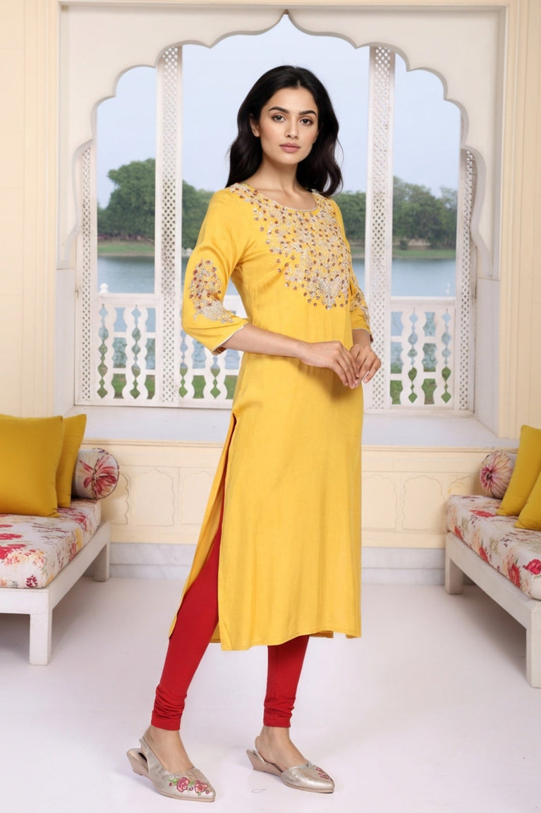 Elevate your ethnic wardrobe with this exquisite blue kurta. Crafted from 100% viscose, this woven piece boasts a flattering a-line silhouette that drapes beautifully. The three-quarter sleeves offer a perfect balance between comfort and style, while the round neckline adds a touch of elegance. What sets this kurta apart is its stunning embroidery, meticulously crafted to catch the eye and spark conversations. The organza detailing adds a luxurious touch, making it ideal for elevated occasions. Whether you're attending a family gathering or a festive celebration, this kurta will ensure you stand out with its perfect blend of traditional charm and contemporary design.