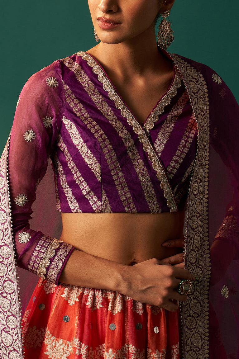 Purple Zari Embroidered Jacquard Blouse with Flared Skirt and Dupatta Set