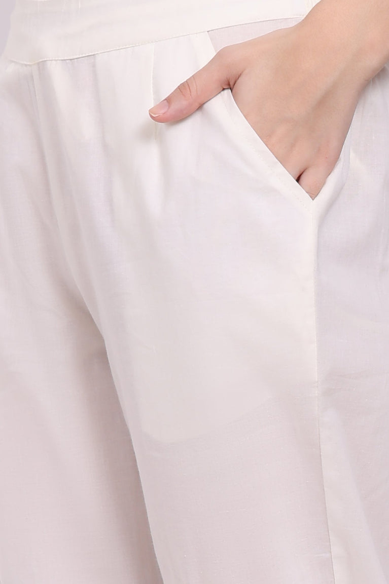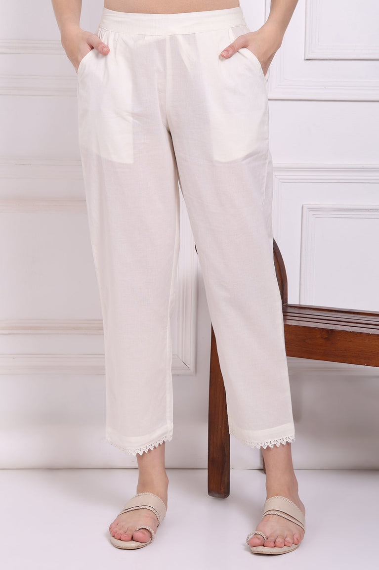 White Solid Pure Cotton Ankle Length Straight Pants with Lace