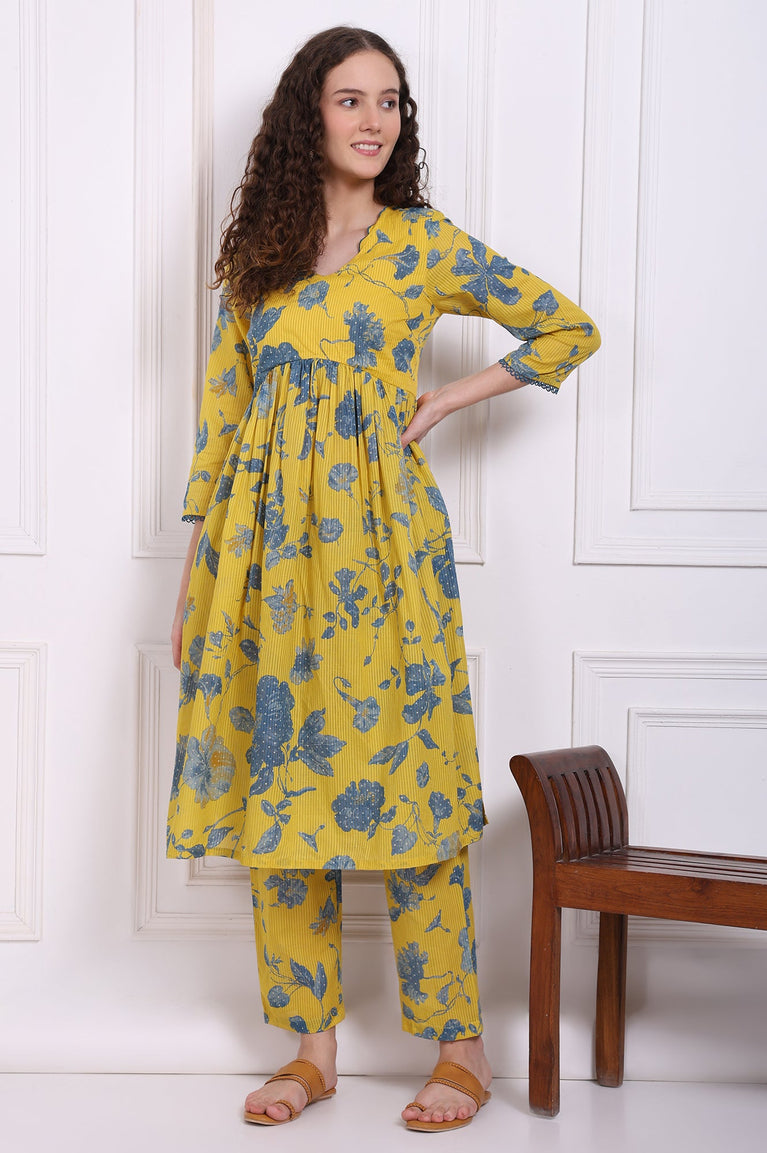 Brighten up your wardrobe with this cheerful and breezy pure cotton modern yellow flared kurta and pants co-ord set. Crafted from soft, breathable pure cotton, this ensemble features a vibrant floral print that exudes freshness and summer charm. The flared kurta offers a relaxed, feminine silhouette with a playful bounce, while the straight-fit pants ensure comfort and ease of movement. Perfect for day outings, brunches, or casual festive gatherings, this co-ord set effortlessly blends comfort with standout style.
