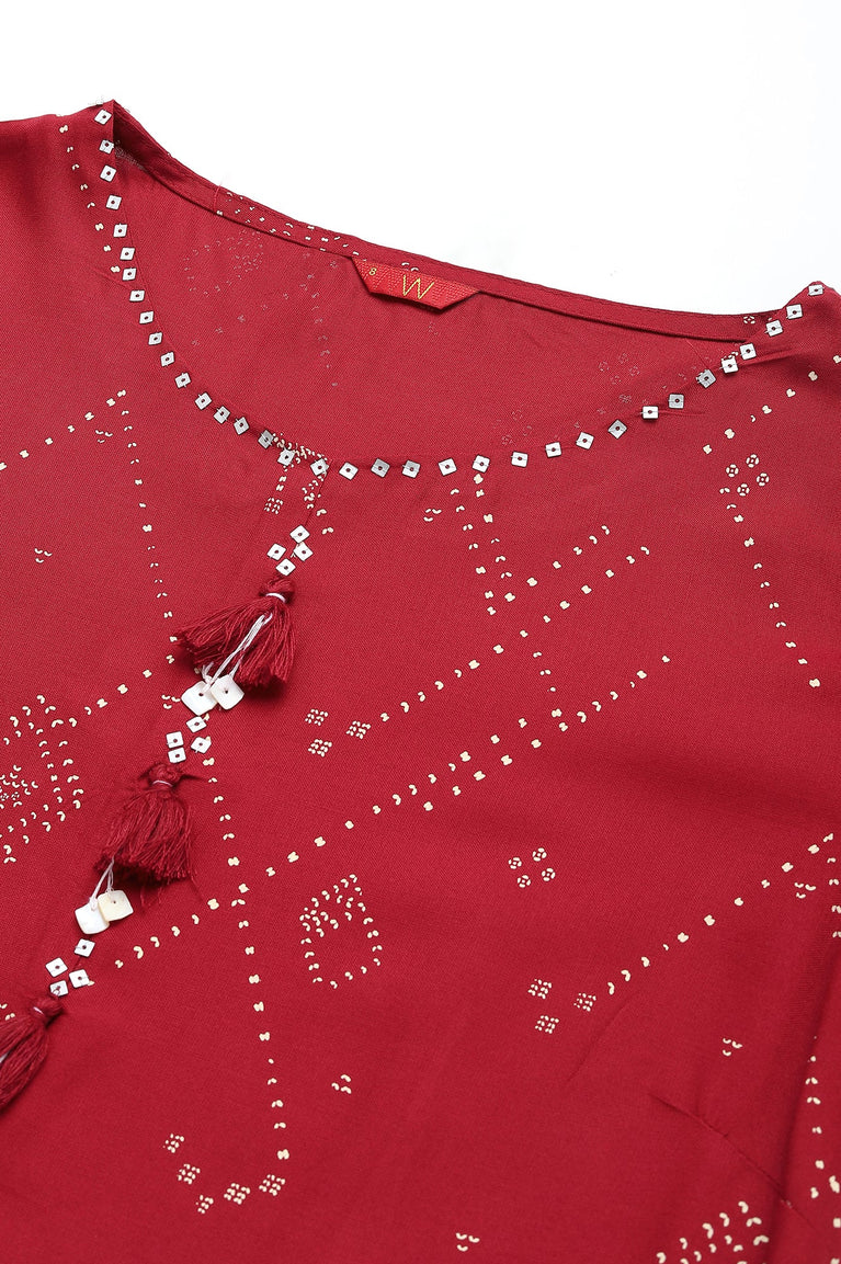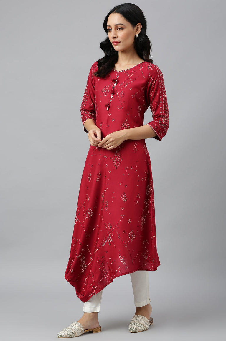 Make a bold statement with this striking red A-line kurta, designed for casual wear. This ethnic piece features a beautiful geometric print that adds a contemporary twist to traditional design. Crafted from 100% viscose, the kurta offers a soft, flowing feel that's perfect for all-day comfort. The three-quarter sleeves and round neckline contribute to its classic yet modern appeal. The A-line silhouette is flattering for various body types, providing a graceful and elegant look. The use of rayon fabric ensures a luxurious drape and a smooth texture against the skin. This woven garment is perfect for those who appreciate the fusion of traditional and modern elements in their ethnic wear. Whether you're attending a casual gathering or simply want to add a touch of elegance to your everyday look, this kurta is an excellent choice. Its vibrant red color and intricate geometric pattern make it a standout piece in any wardrobe.