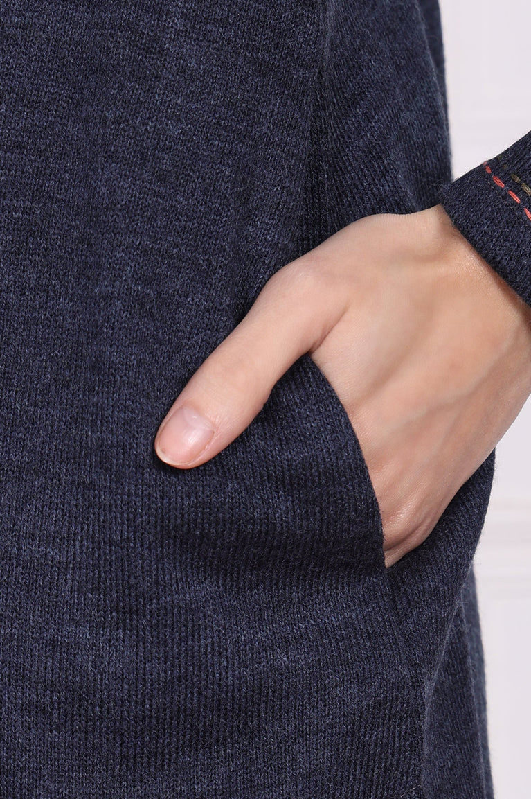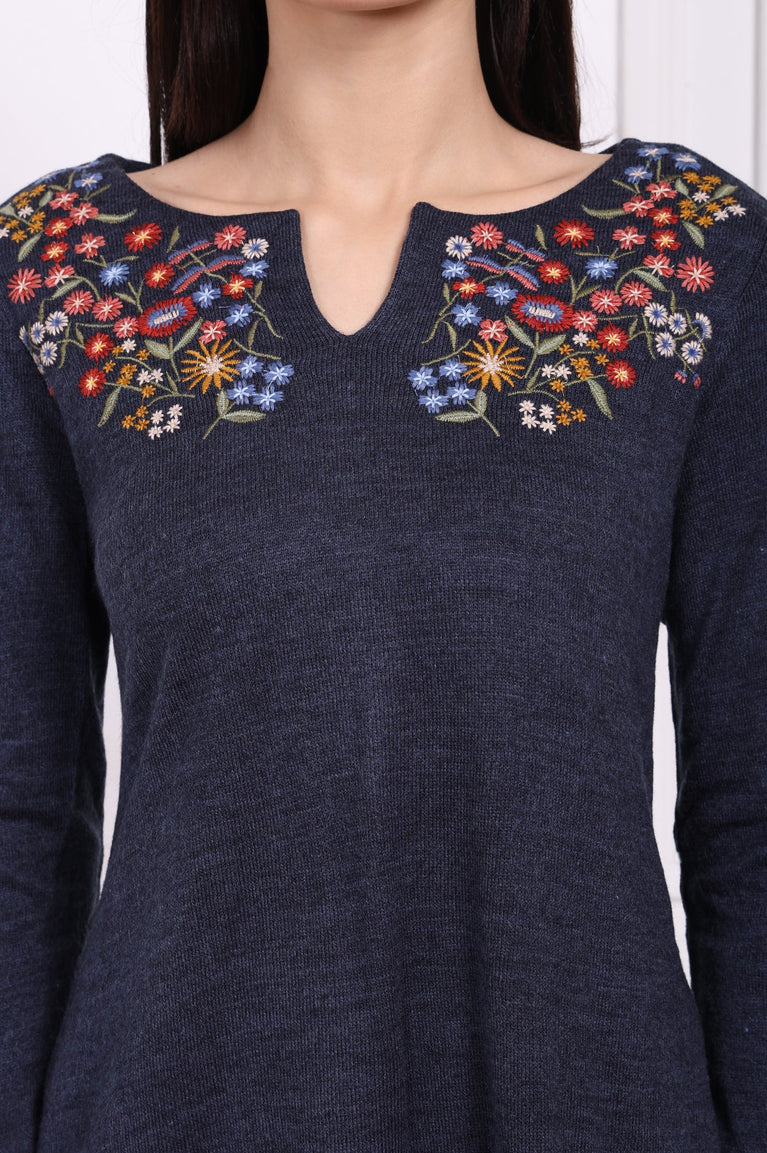A cozy embrace of winter style, this deep navy tunic for women is crafted to offer both warmth and effortless elegance. It’s the kind of piece you’ll find yourself reaching for on crisp mornings and chilly evenings alike. The design masterfully draws the eye to a beautifully detailed yoke, where a garden of vibrant floral embroidery blooms around the chic notched round neckline, adding a perfect touch of artisanal charm to the solid canvas. This lovely winter kurta features comfortable full sleeves, which are thoughtfully finished with delicate stitch detailing at the cuffs for a subtle, refined accent that you'll appreciate up close. Cut in a timeless straight silhouette, this apparel glides gracefully over your form, ensuring a flattering and comfortable fit that never feels restrictive. The clean, straight hemline is complemented by practical side slits on both sides, a classic detail that allows for effortless movement as you go about your day. Crafted from a soft, opaque fabric, it provides complete coverage for confident wear. This versatile long sleeve acrylic tunic is a singular statement of comfort and style, a must-have for your cold-weather wardrobe that pairs beautifully with your favorite leggings or trousers. You'll love how it makes you feel.