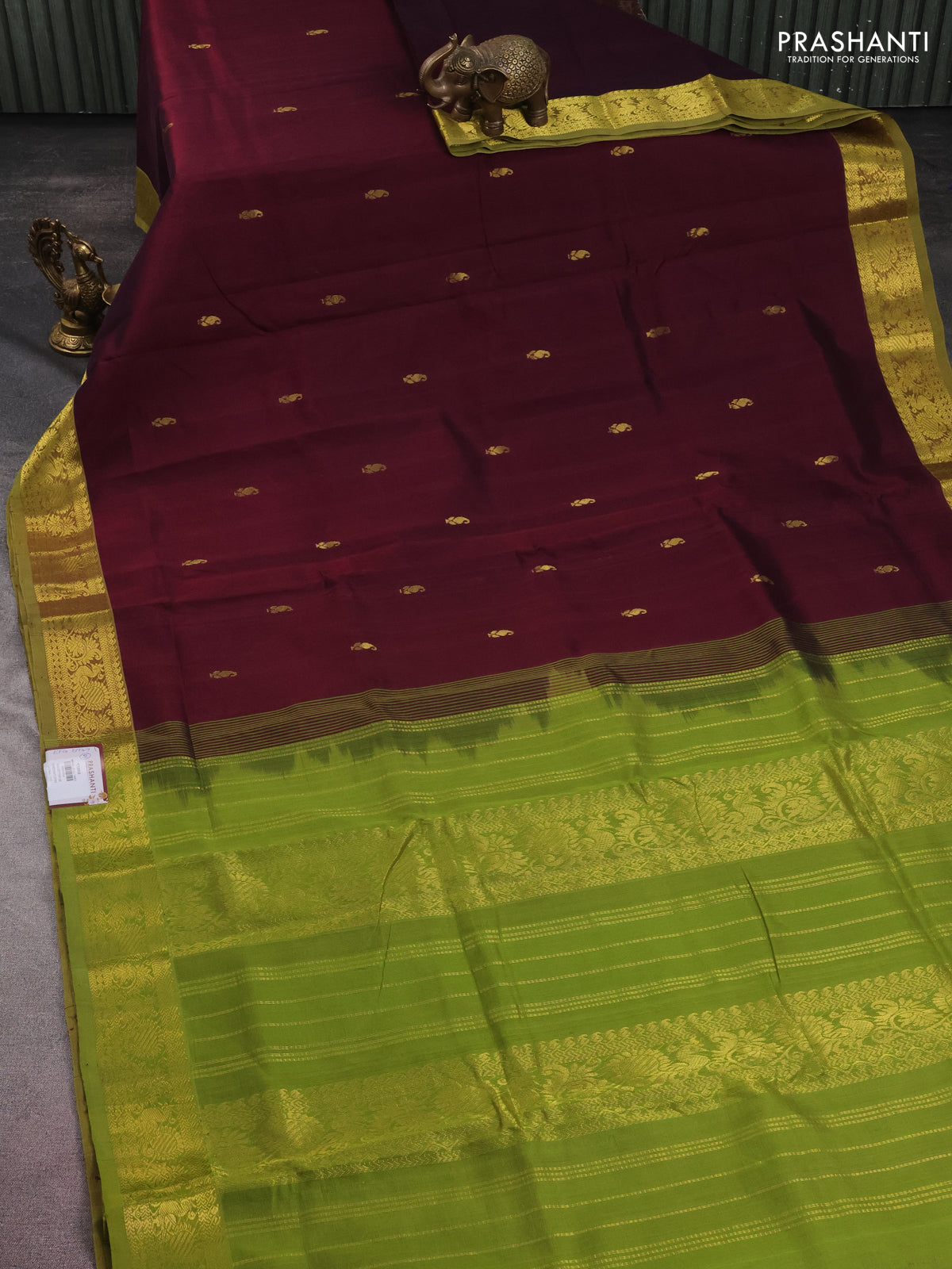 10 yards silk cotton saree deep maroon and mehendi green with zari woven buttas and zari woven border