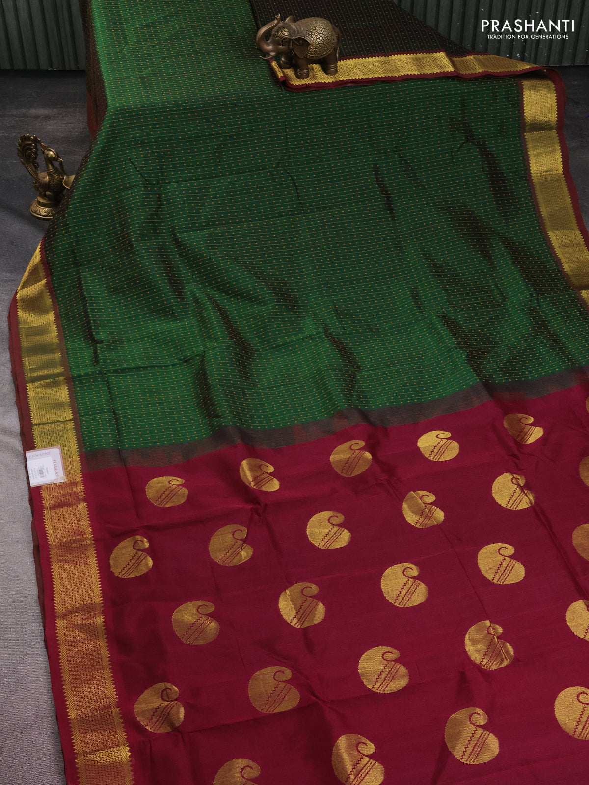 10 yards silk cotton saree green and maroon with allover thread woven lakshadeepam weaves and zari woven border