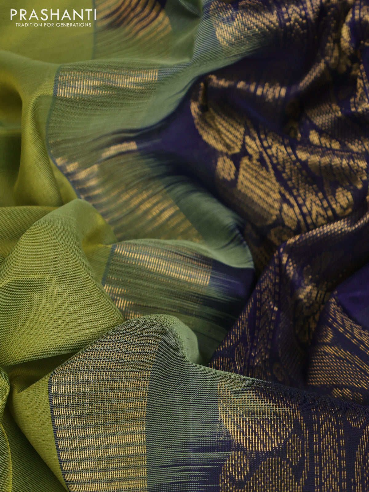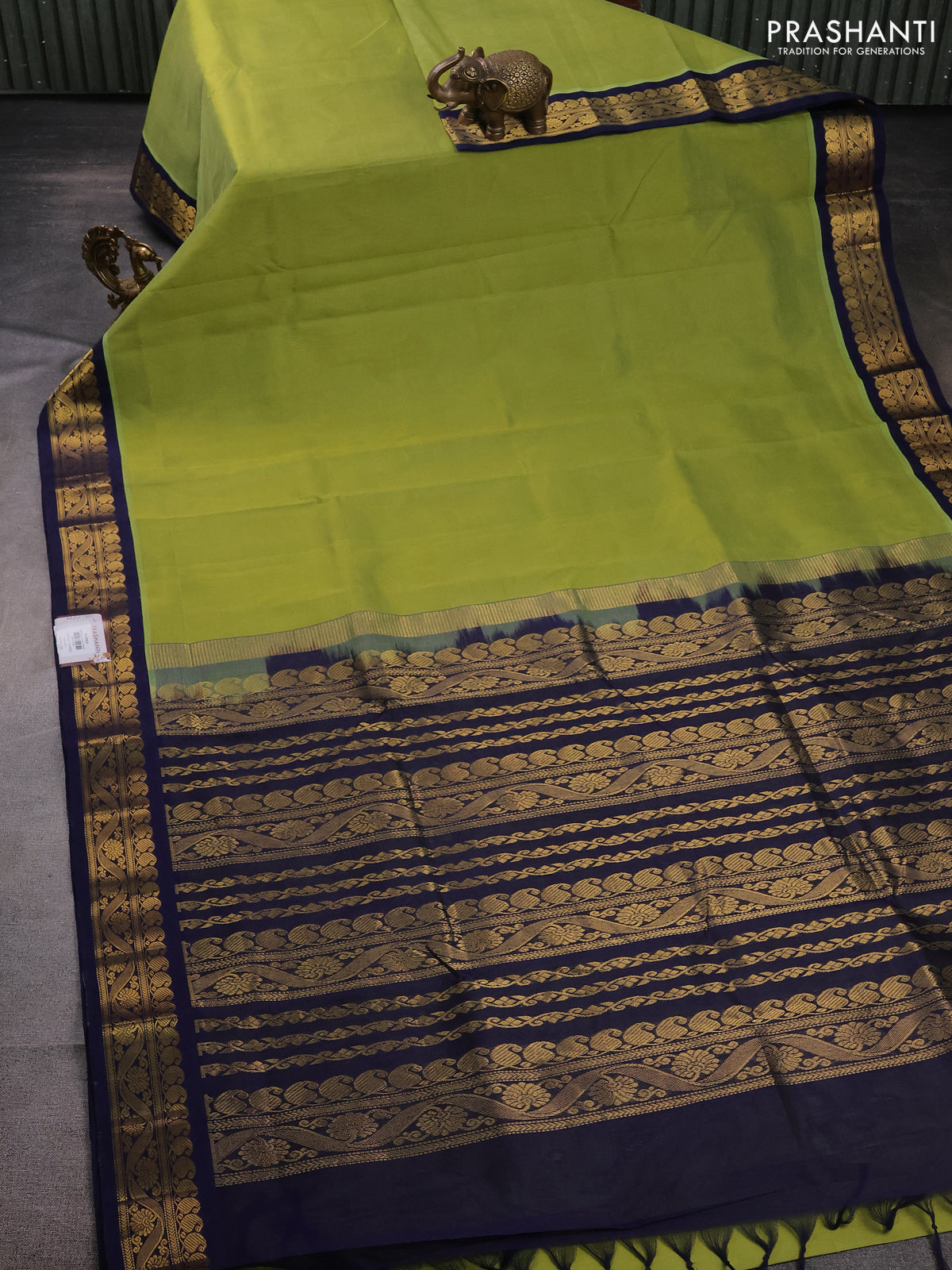 10 Yards silk cotton saree light green and blue with plain body and zari woven korvai border