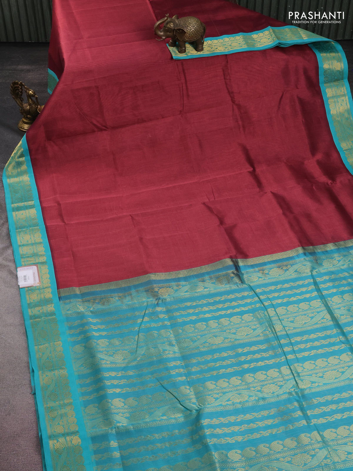 10 yards silk cotton saree maroon shade and teal blue with plain body and zari woven border
