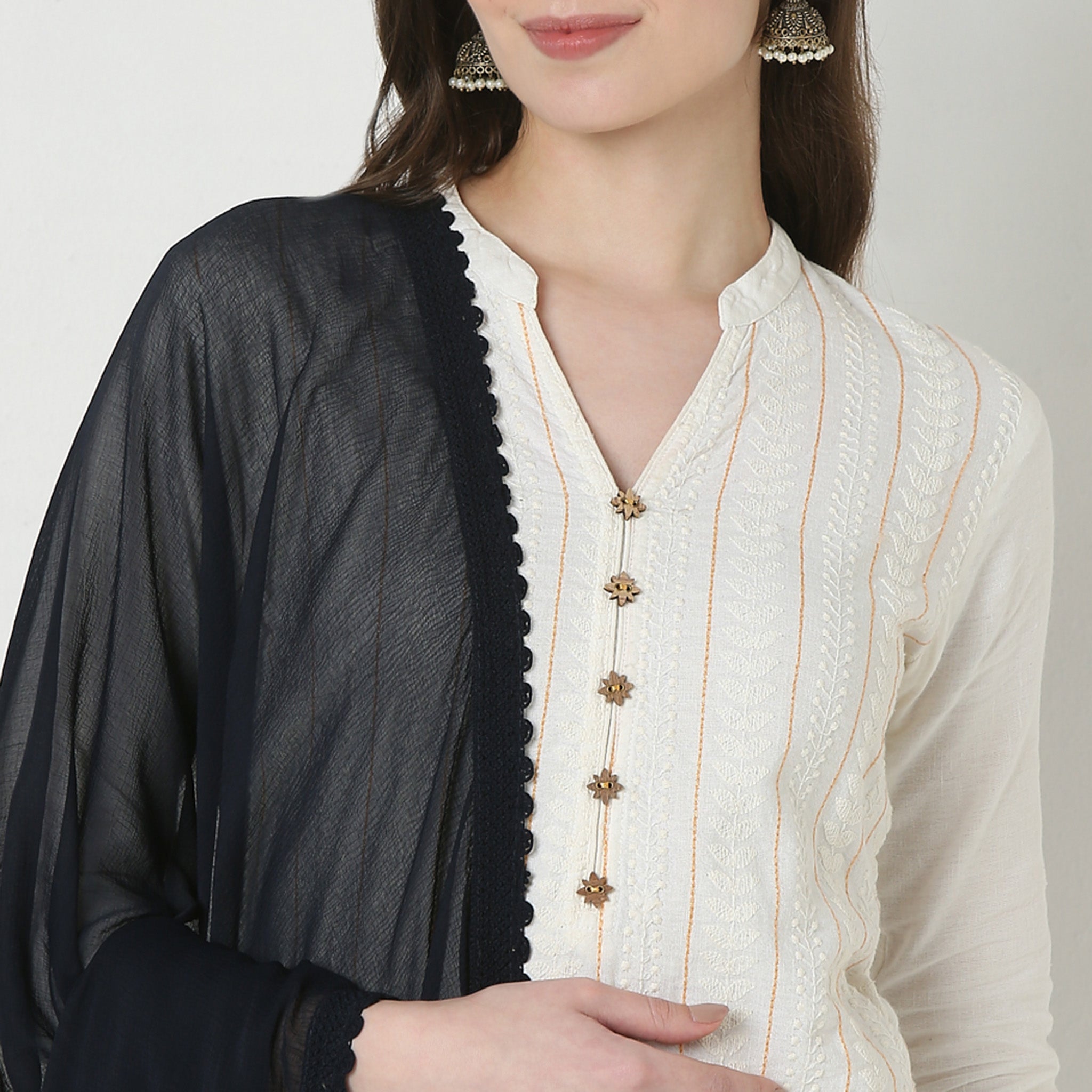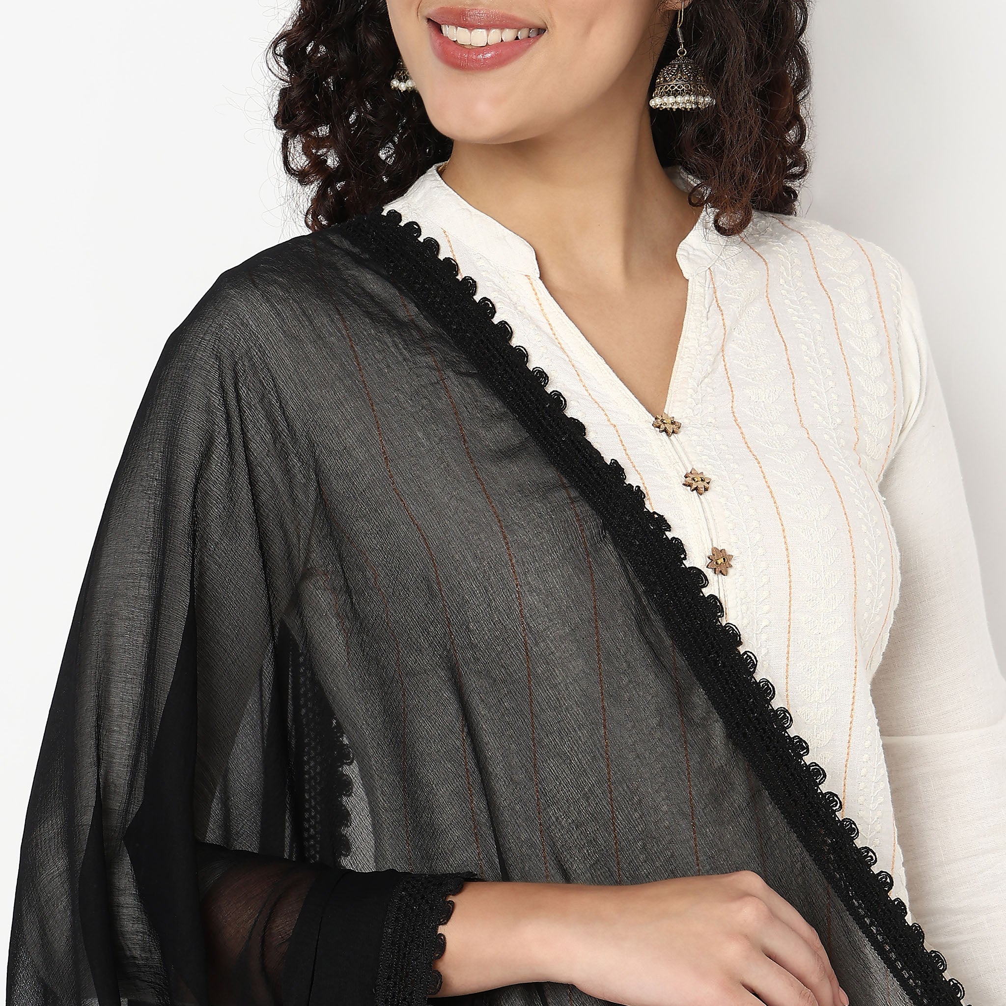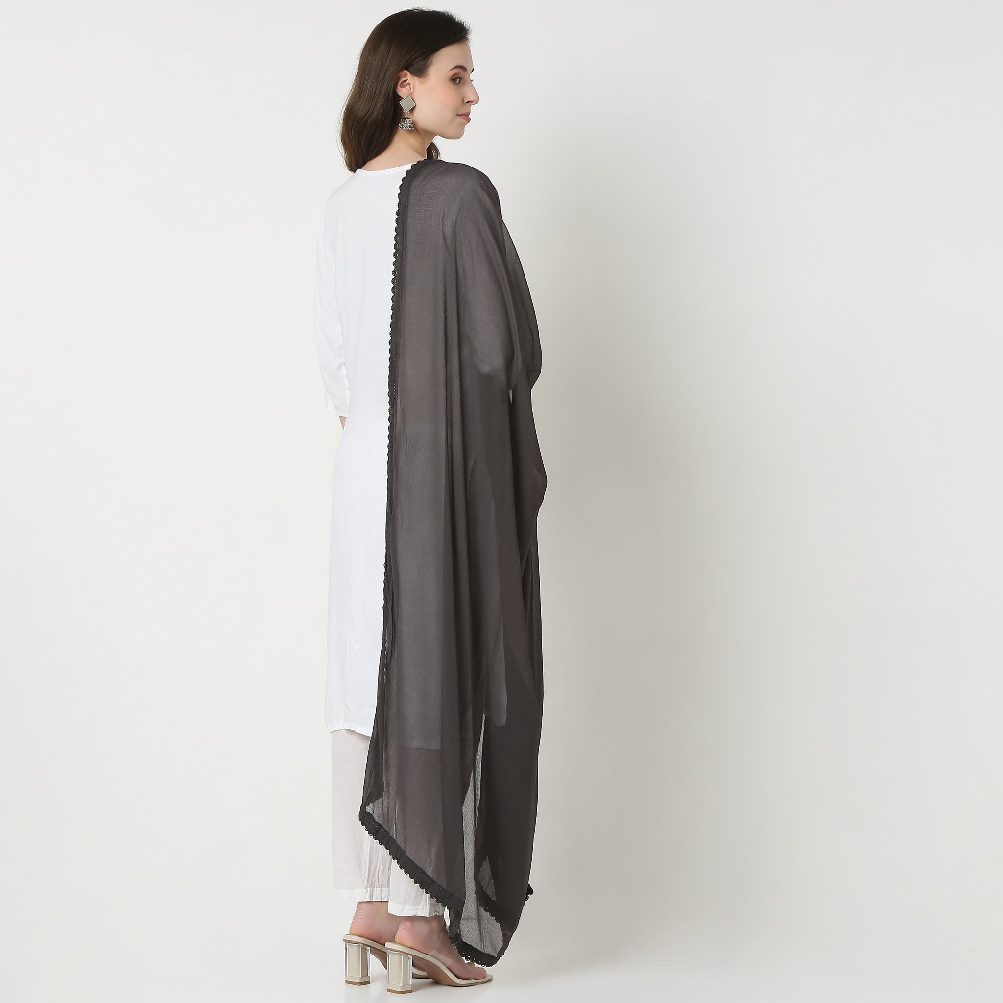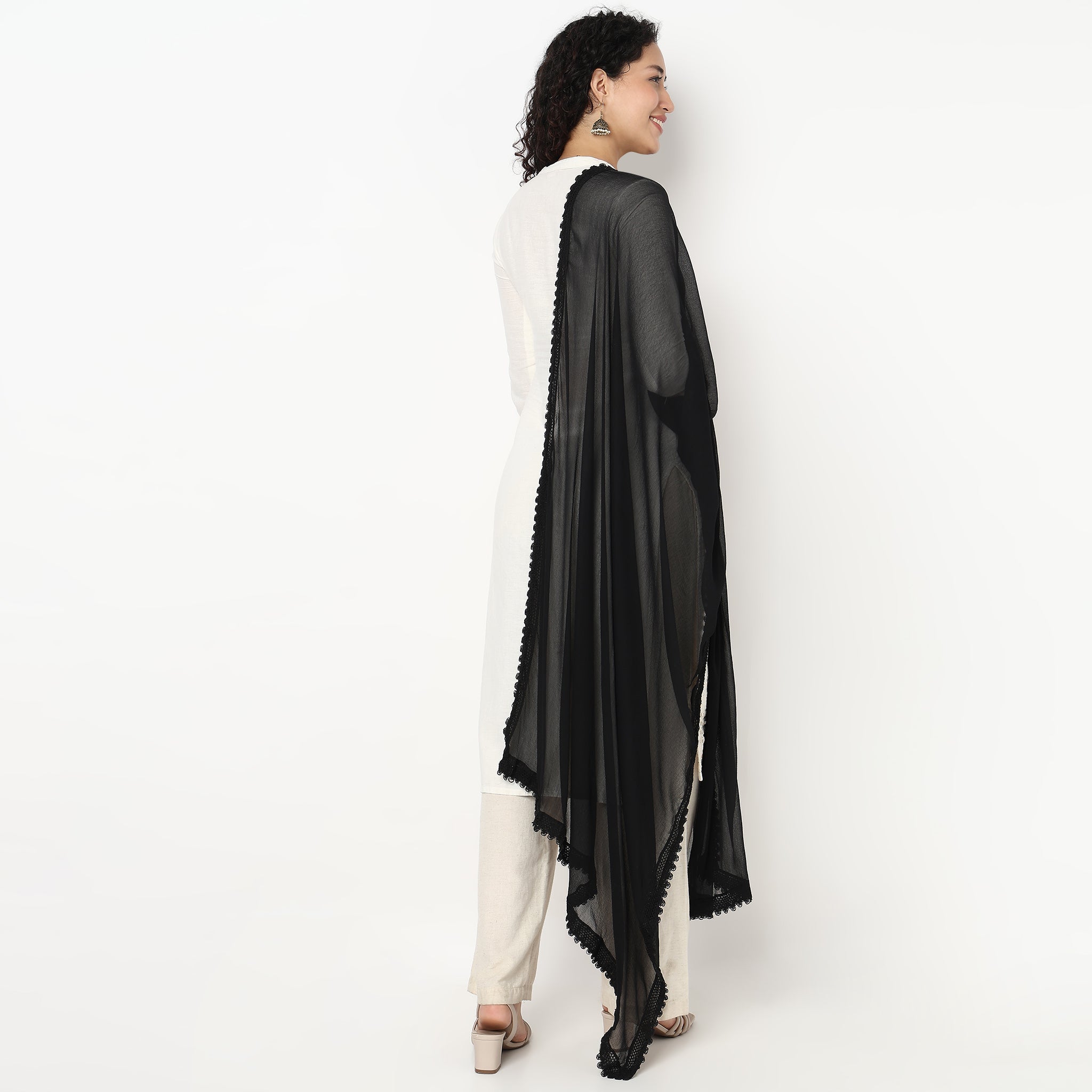 Wrap yourself in elegance with our Chiffon Dupatta, designed to add a touch of sophistication to any outfit. The luxurious feel of 100% nylon chiffon ensures comfort and breathability, making it perfect for any season. The solid pattern and delicate lace trim create a timeless piece that can effortlessly elevate your look, whether you're attending a festive occasion or a casual gathering.