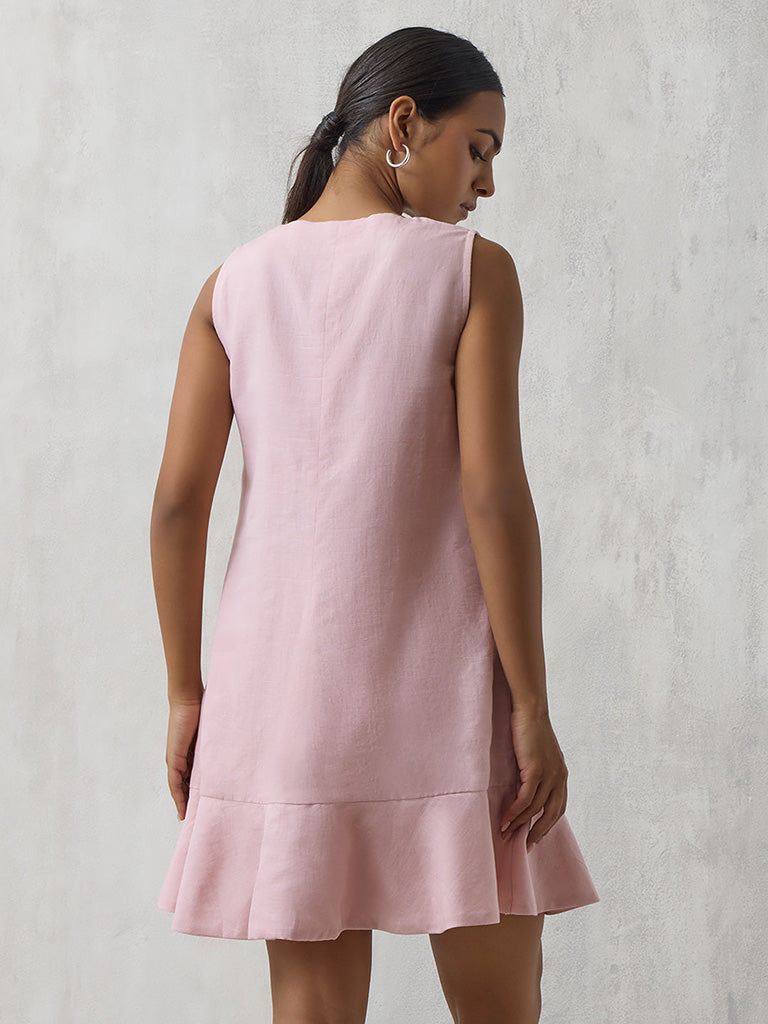 Add a touch of ease to your daytime repertoire with this pink A line dress. Crafted from linen, it features a flattering V-neckline and sleeveless frame for effortless comfort. The layered hemline lends a playful finish, making it perfect for brunches, travel, or warm-weather outings.