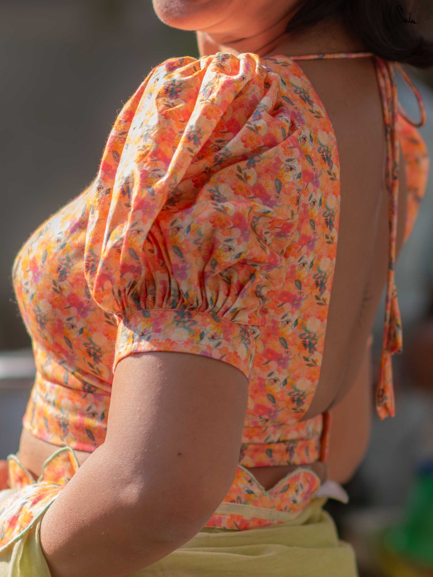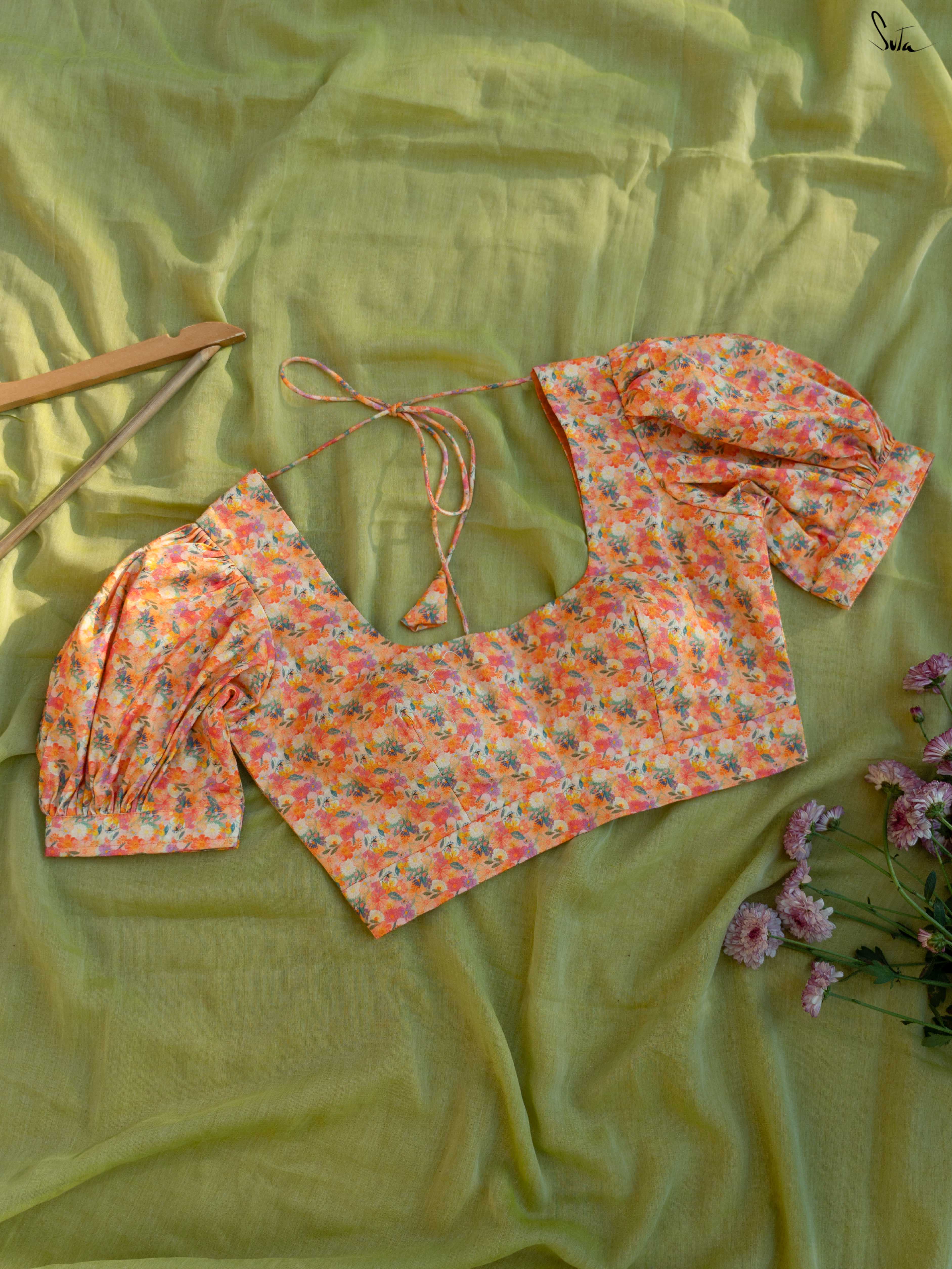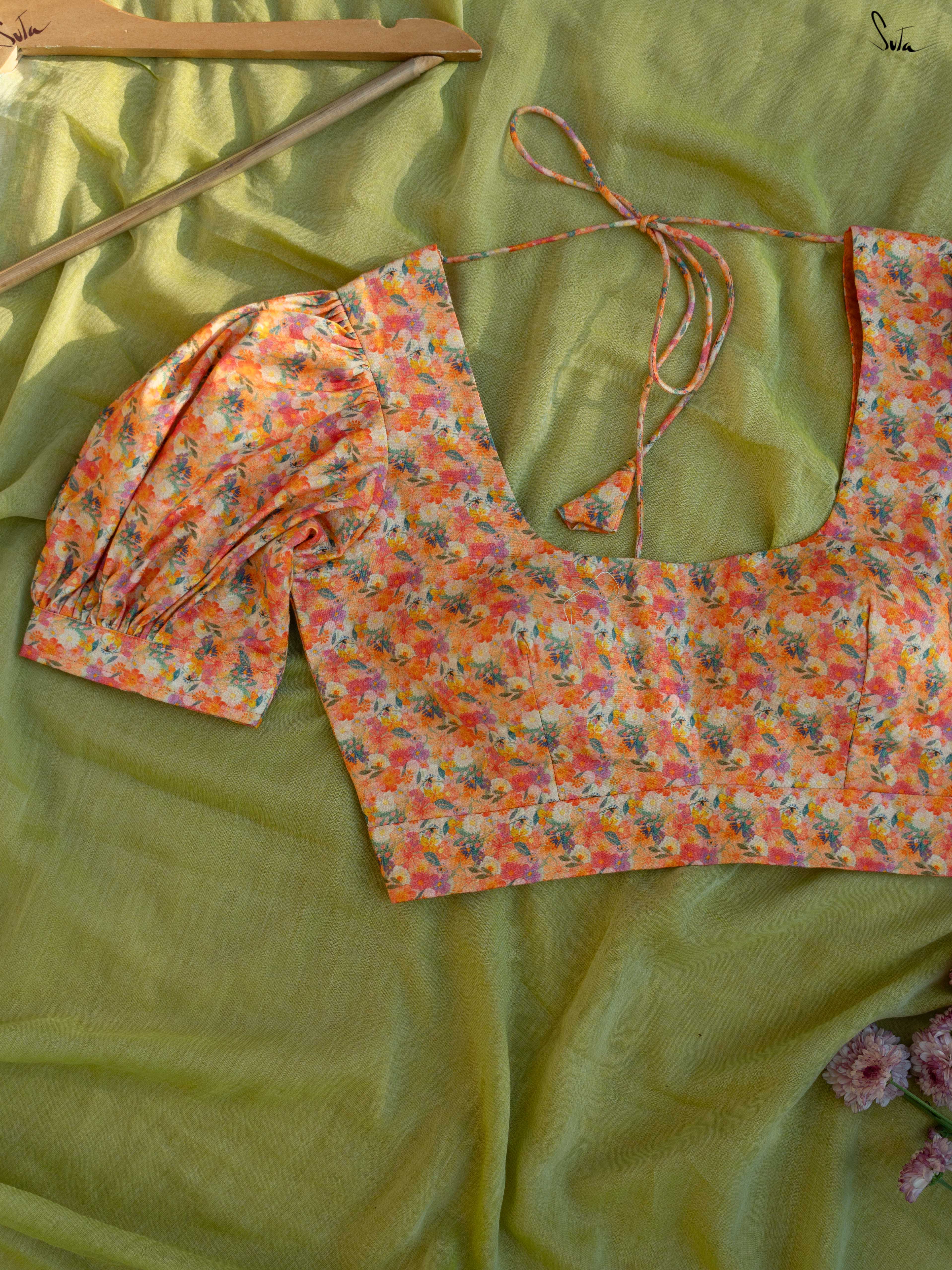 Playful structure with everyday comfort. Amit Chandni is crafted in breathable Cambric cotton that feels soft and easy on the skin. The multicolour print adds charm, while the square neckline and shirt-style puff sleeves bring a hint of vintage drama. Finished with a padded fit and back opening, this blouse balances statement details with all-day comfort - perfect for elevating simple cotton sarees.