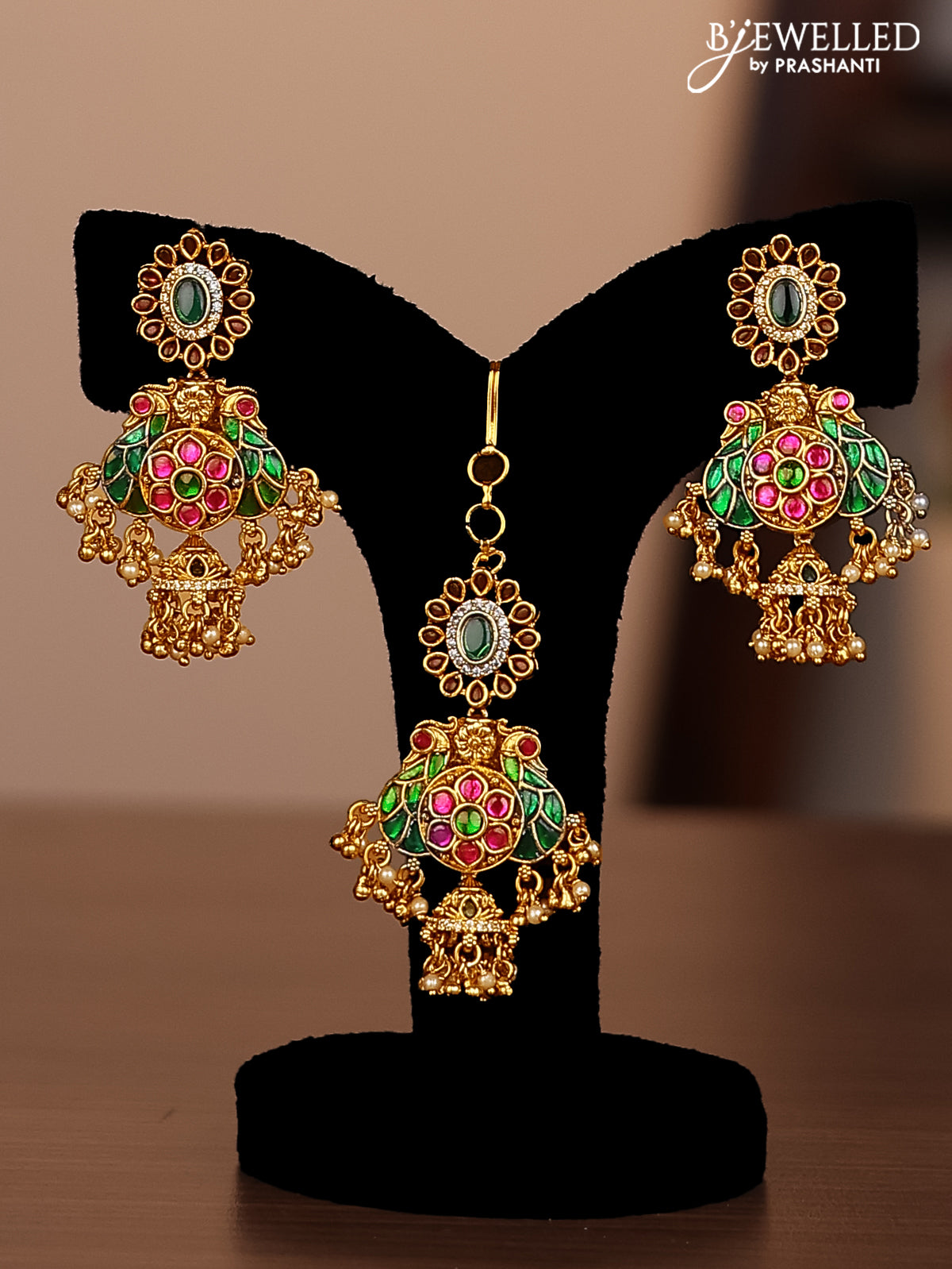 Antique combo set double layer peacock design with jadau cz stones and pearl & golden beads hanging